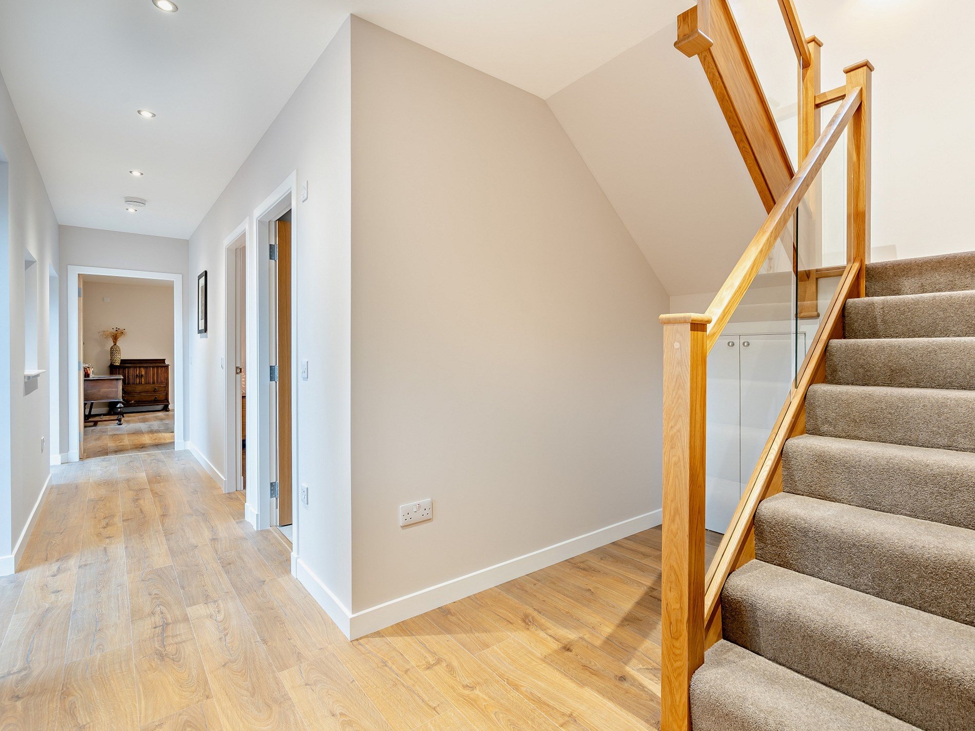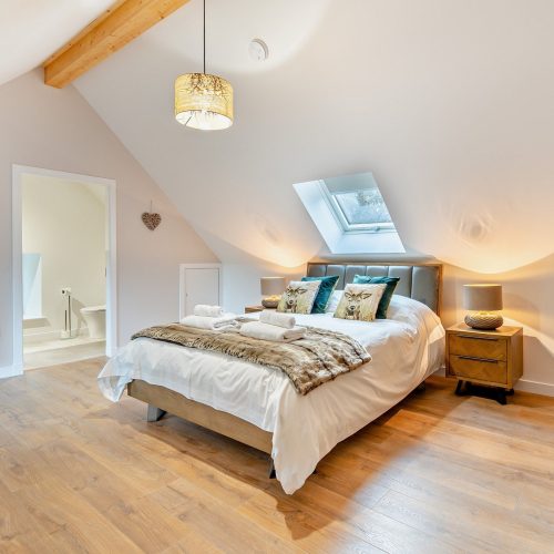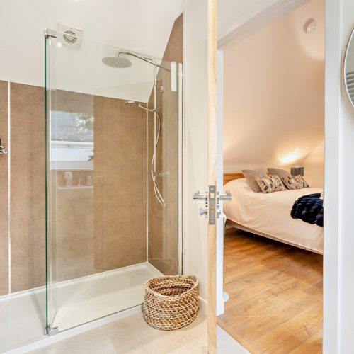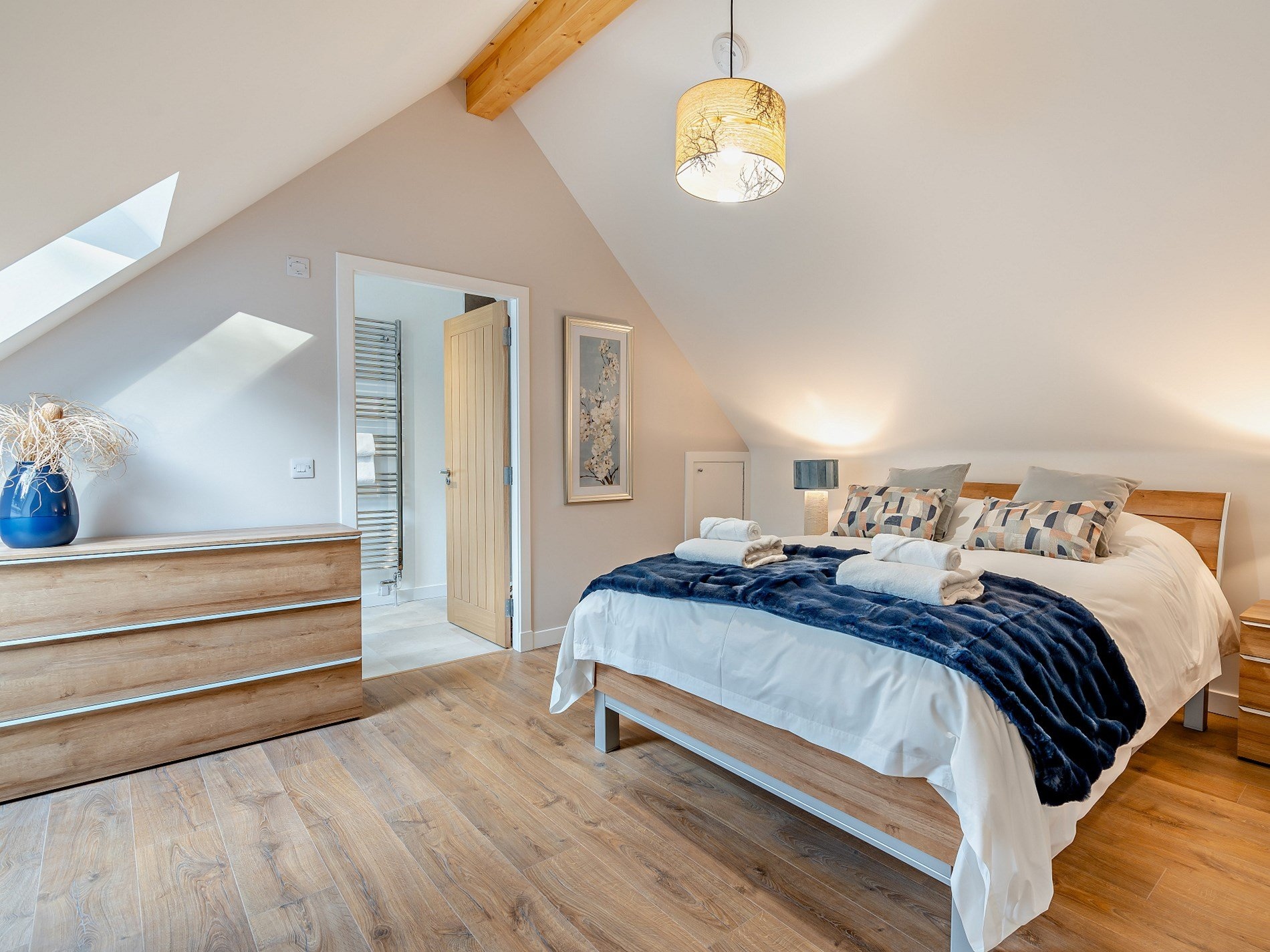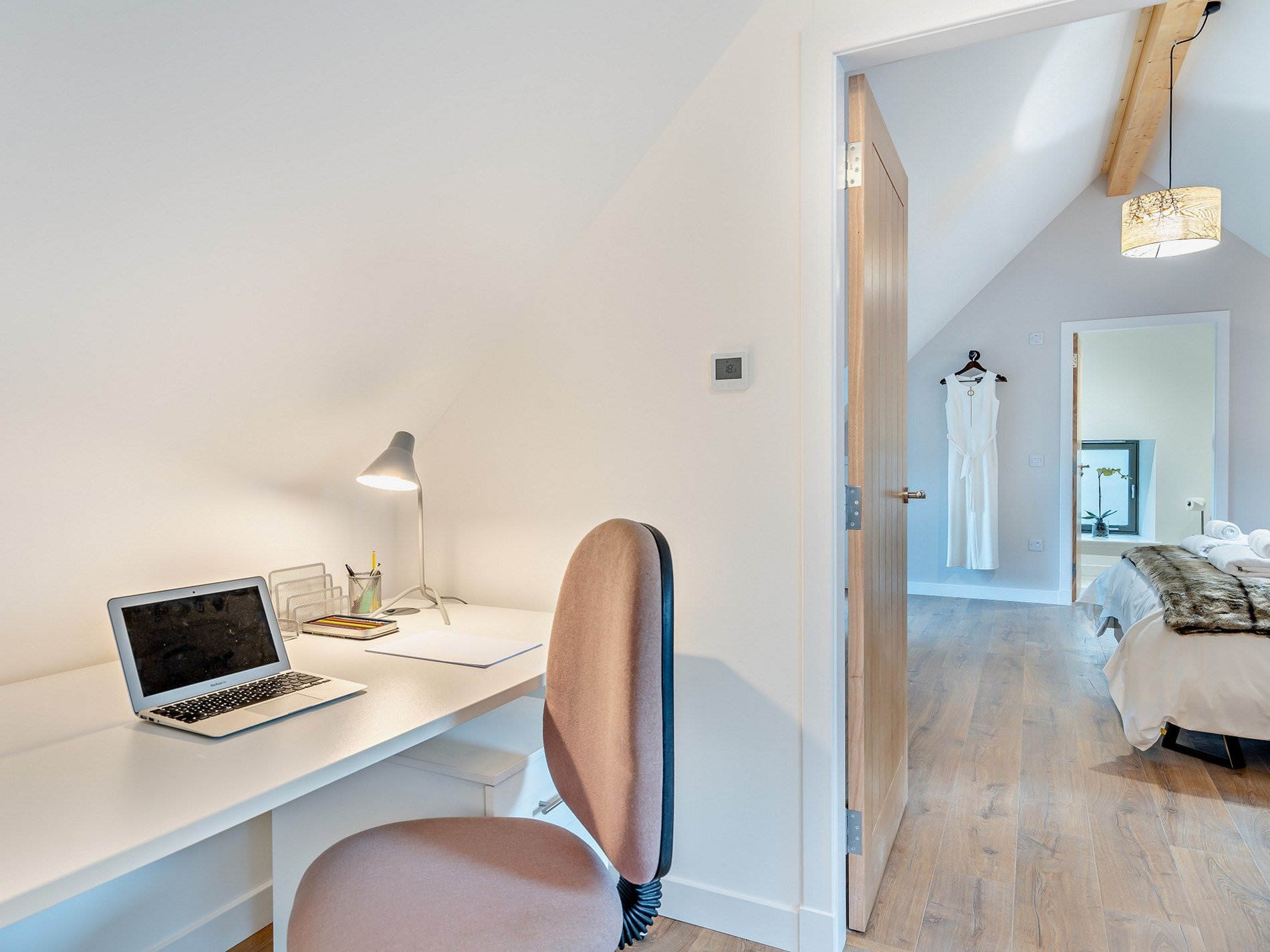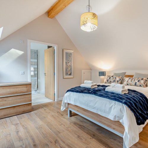 Stepping through the front door into a generously spacious entrance hall, a bench invites you to pause, providing a practical space to hang coats and remove shoes. With underfloor heating throughout the ground-floor area, your toes will be toasty in no time. The lounge, with a double-height ceiling, offers an airy ambiance complimented by the addition of a wood burner, promising cosy evenings. Unwind in front of the large Smart TV with a state-of-the-art sound bar creating an immersive experience. The contemporary open-plan kitchen, with floor-to-ceiling windows, is the heart of the house with a spacious and well-equipped kitchen for those who enjoy cooking. Slide open the kitchen’s patio doors to unveil a covered seating area, seamlessly connecting indoor and outdoor spaces. A utility room and WC provide practicality and convenience. The ground floor hosts two thoughtfully designed bedrooms, the first featuring an en-suite shower room for added comfort, and the second bedroom with a neighbouring shower room, offering flexibility for guests. The upper floor offers two spacious bedrooms, each with luxury en suites. A dedicated seating/study area transforms into a quiet reading space, complete with a desk for catching up on emails, and comfortable seating for simply enjoying a peaceful moment.