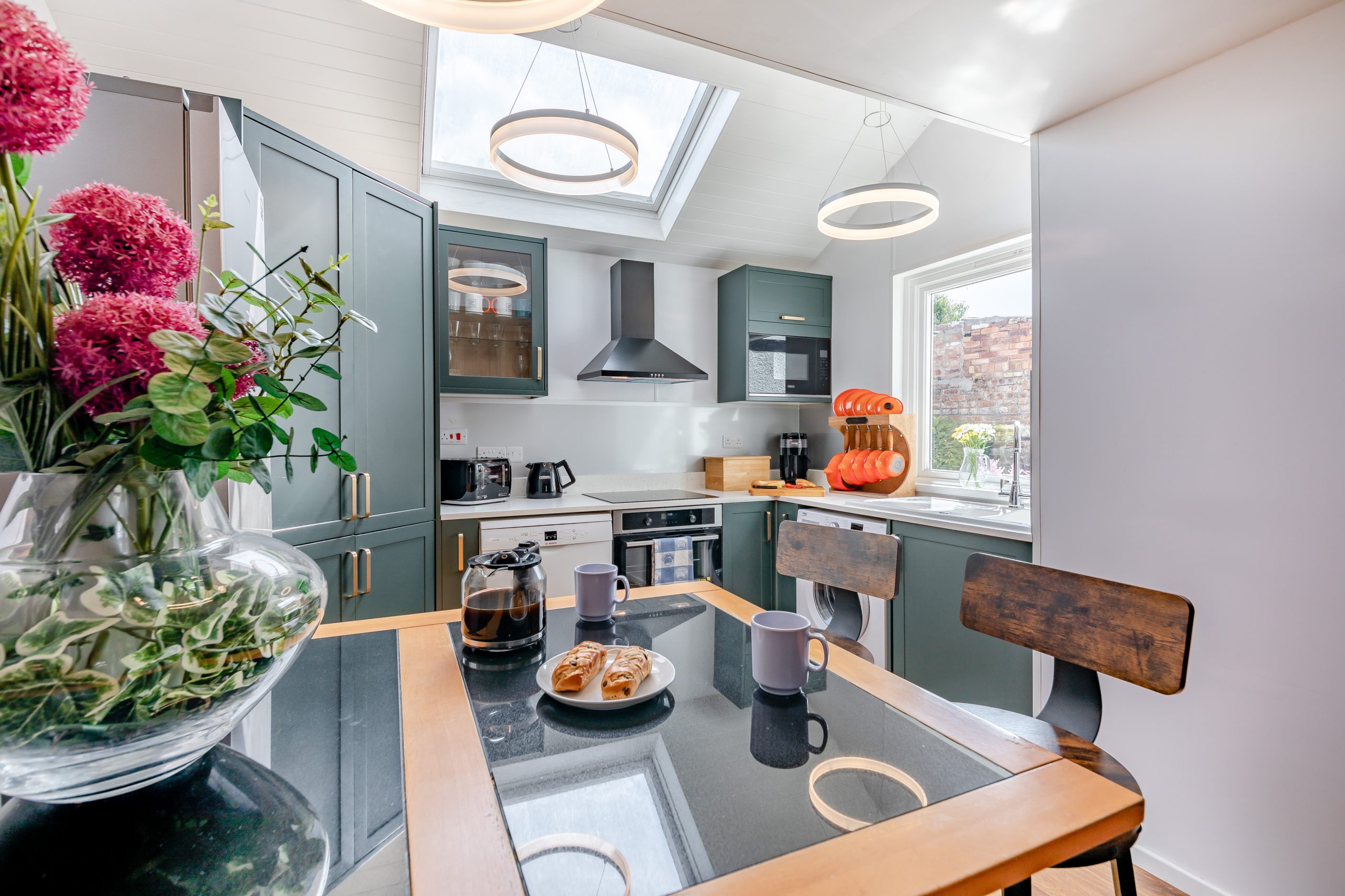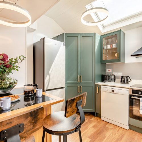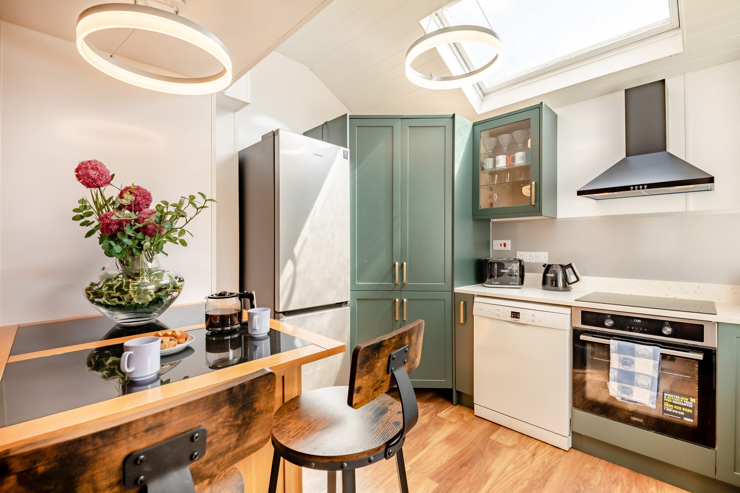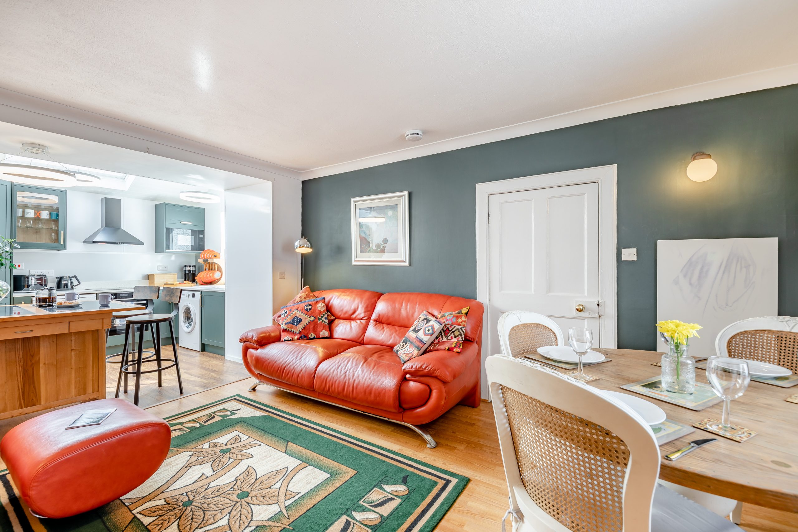 Step into the entrance hallway, which leads into the open-plan lounge/kitchen/diner at the heart of this home-away-from-home. Featuring a beautiful colour palette, along with homely touches throughout, this welcoming space perfectly blends rich heritage with contemporary elements, inviting you to unwind at the end of a long day. The roaring open fire sets the scene for ultimate relaxation. The well-equipped, modern kitchen allows you to cook up a feast for evening mealtimes served at the dining table. The breakfast bar with two stools is perfect for a quick drink before you head out for the day, and there is a useful shower room on the ground level too. Retire to the first floor to discover a wonderfully tranquil super-king-size bedroom with an en-suite bathroom, or climb the small flight of additional stairs to the generous twin bedroom tucked beneath the eaves, which showcases a characterful sloping ceiling and antique-style decor.