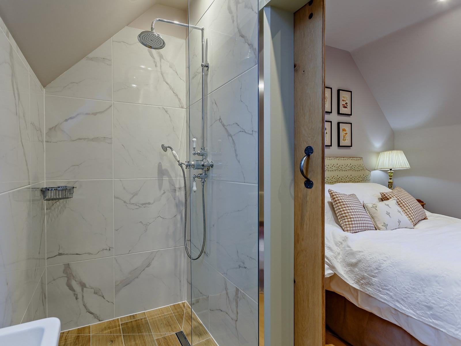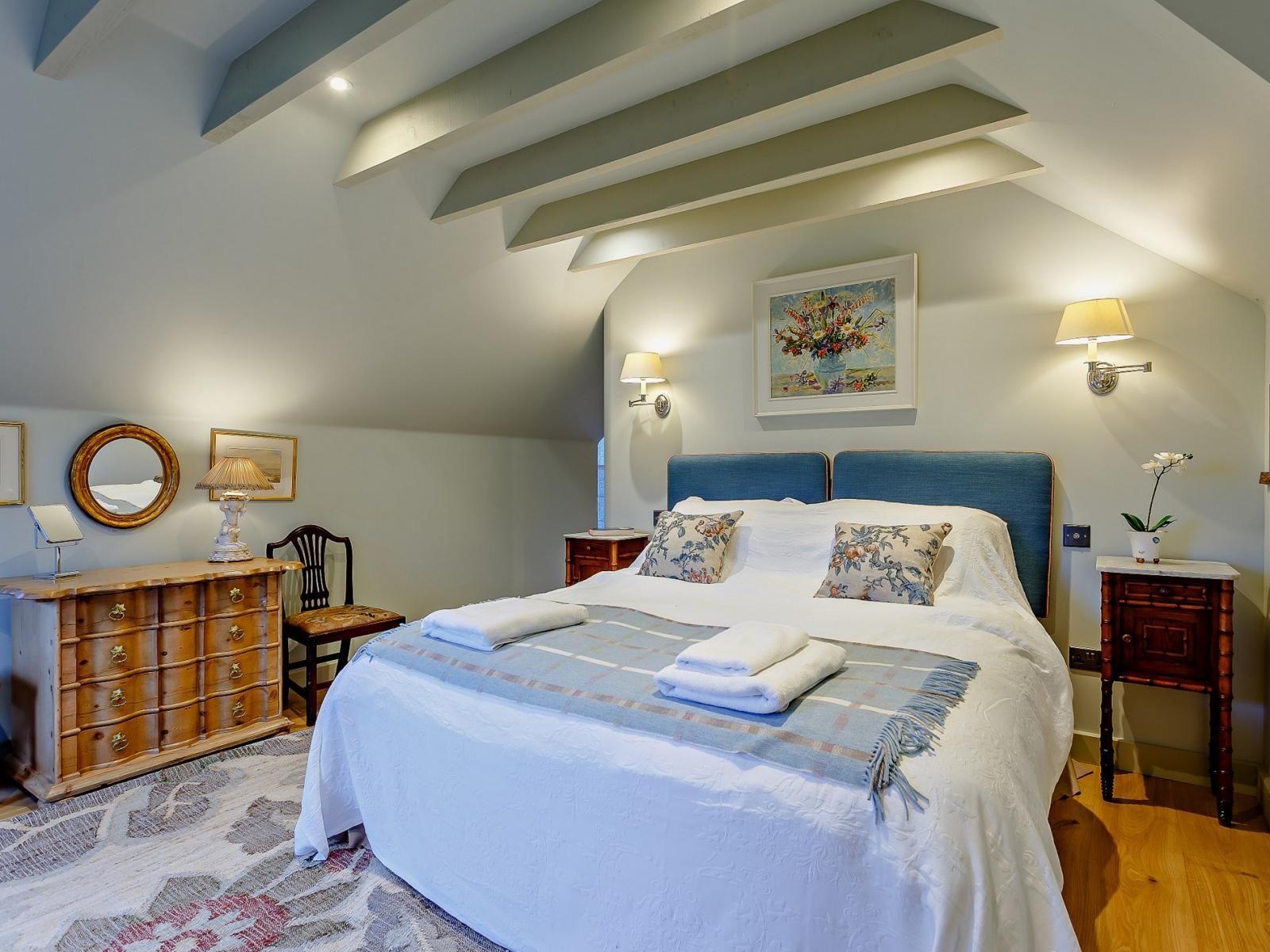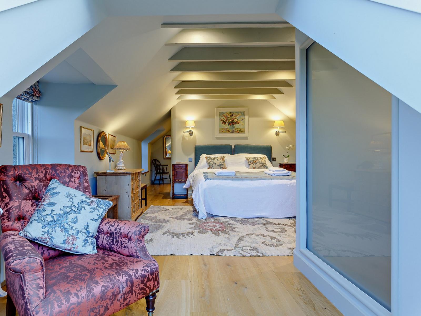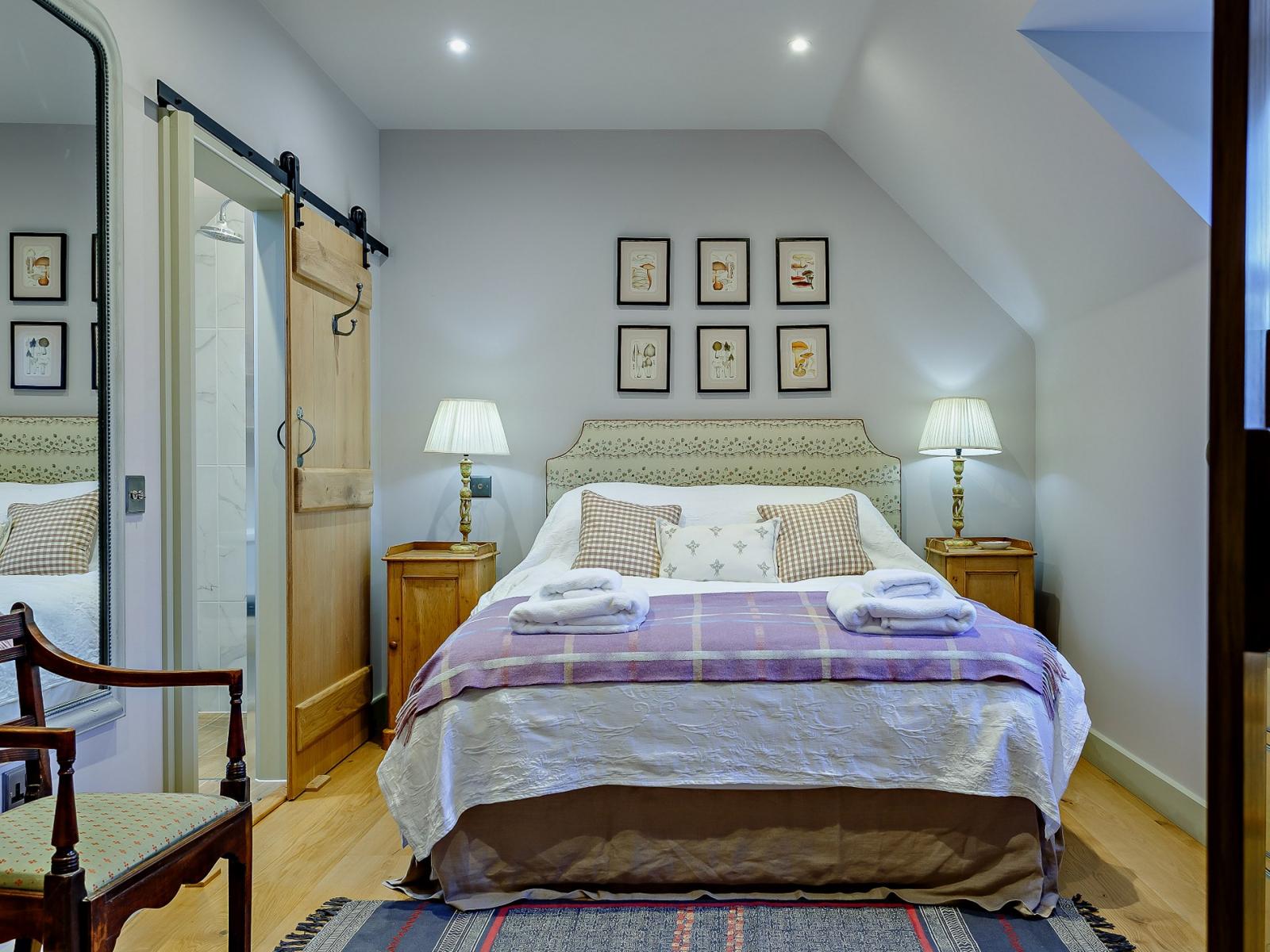 On entering this elegant holiday home, you’ll step straight into the delightful and welcoming lounge, which is an ideal space to relax with a seating area overlooking the river. The lounge area features a comfortable sofa where you can unwind and watch your favourite movie on the Smart TV. On chilly evenings, cosy up in front of the wood burner after a day spent exploring the scenic surroundings. The kitchen area offers all the equipment you need to rustle up a bite to eat with local produce purchased on your travels. When ready, set the dining table and enjoy a family meal whilst planning your holiday activities. Completing the ground floor is a utility room with a washing machine and dryer and a bathroom with a bath and WC. Heading up the stairs you have two beautifully decorated bedrooms, a double and a zip-and-link king-size both with en-suite shower rooms.